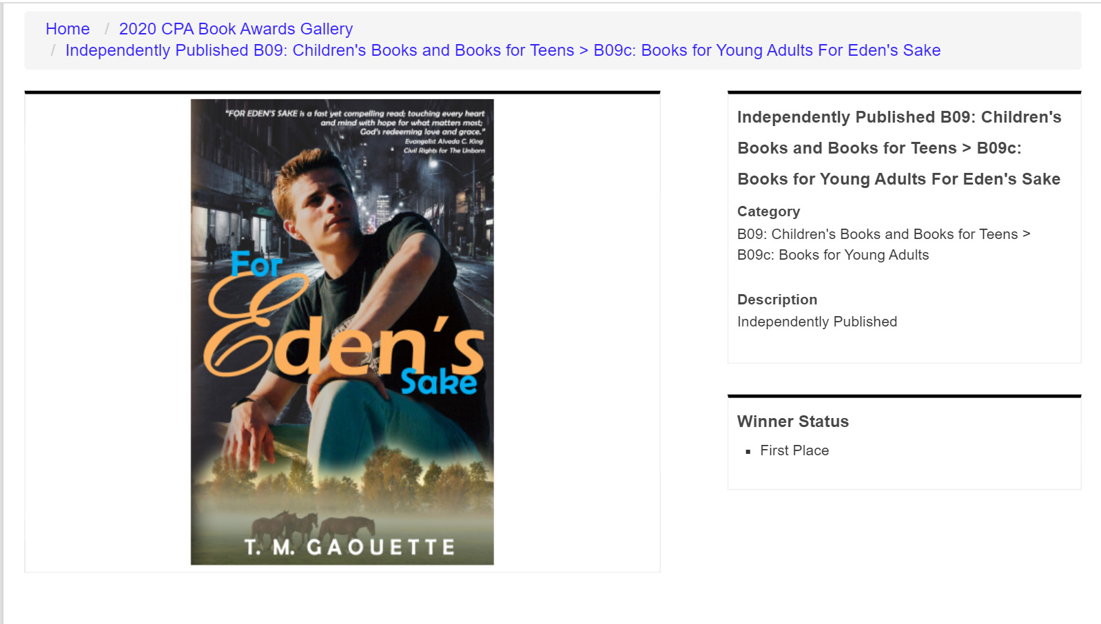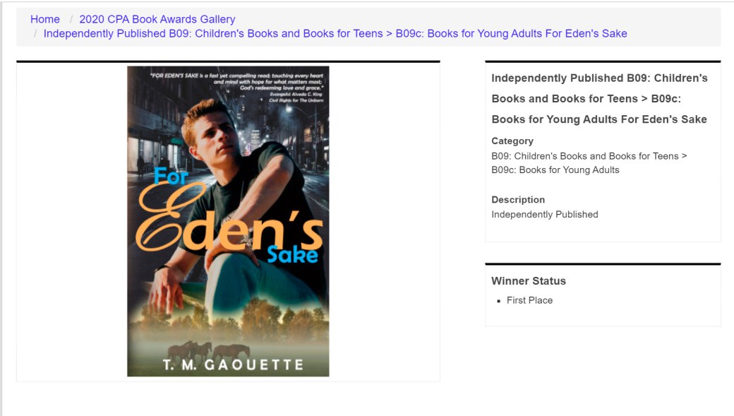 “Author TM Gaouette’s collection of faith-affirming Catholic teen novels has a new addition, For Eden’s Sake. I’m impressed with how unique, and different all Gaouette’s books are, from her heart-warming middle-grade story, her exciting contemporary YA series, to this newly released powerful pro-life novel for older teens.